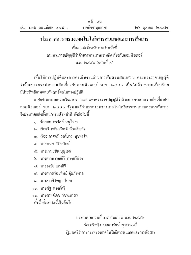 ขอบคุณมากครับ อยากทราบว่า พนักงานเจ้าหน้าที่ ต้องมีคุณสมบัติอะไรบ้างครับ ถึงจะได้เป็น แล้วในรายชื่อ พนักงานเจ้าหน้าที่ ที่ประกาศไปทั้งหมด มีคนใดบ้าง ที่เป็นตัวแทนจากหน่วยงานภาคเอกชน หรือ ผู้ประกอบการด้าน IT เพราะแค่อ่านจากรายชื่อแล้ว ไม่รู้จักใครสักคน